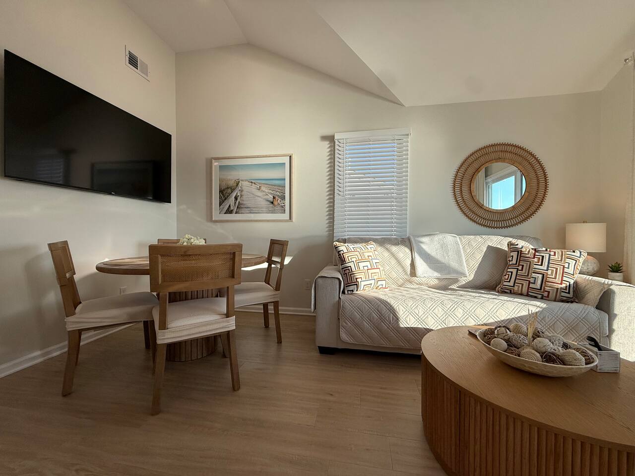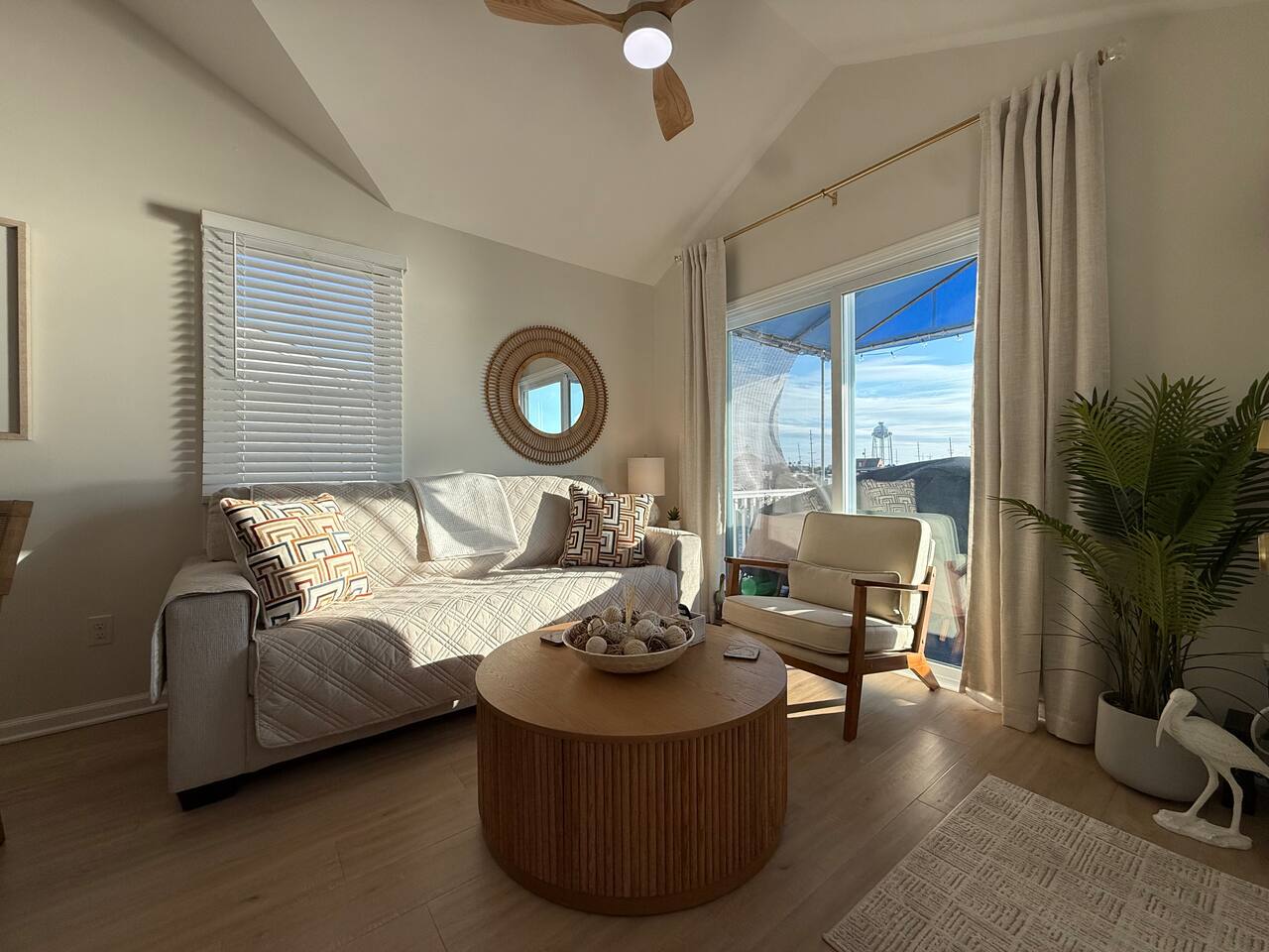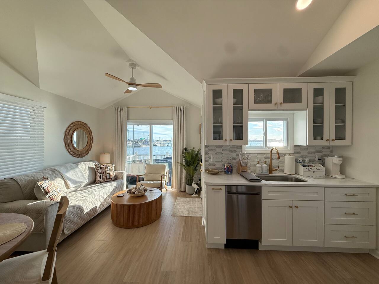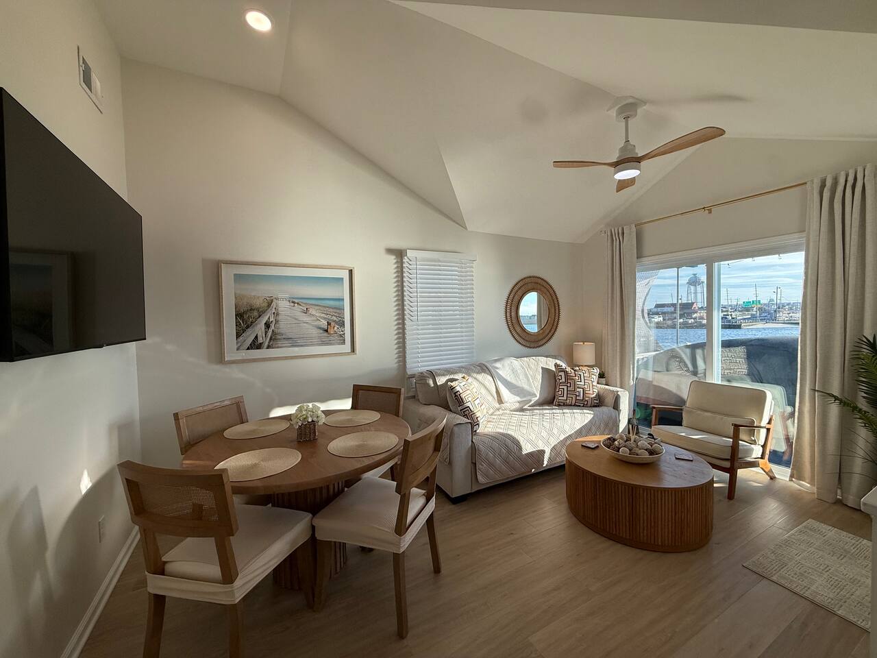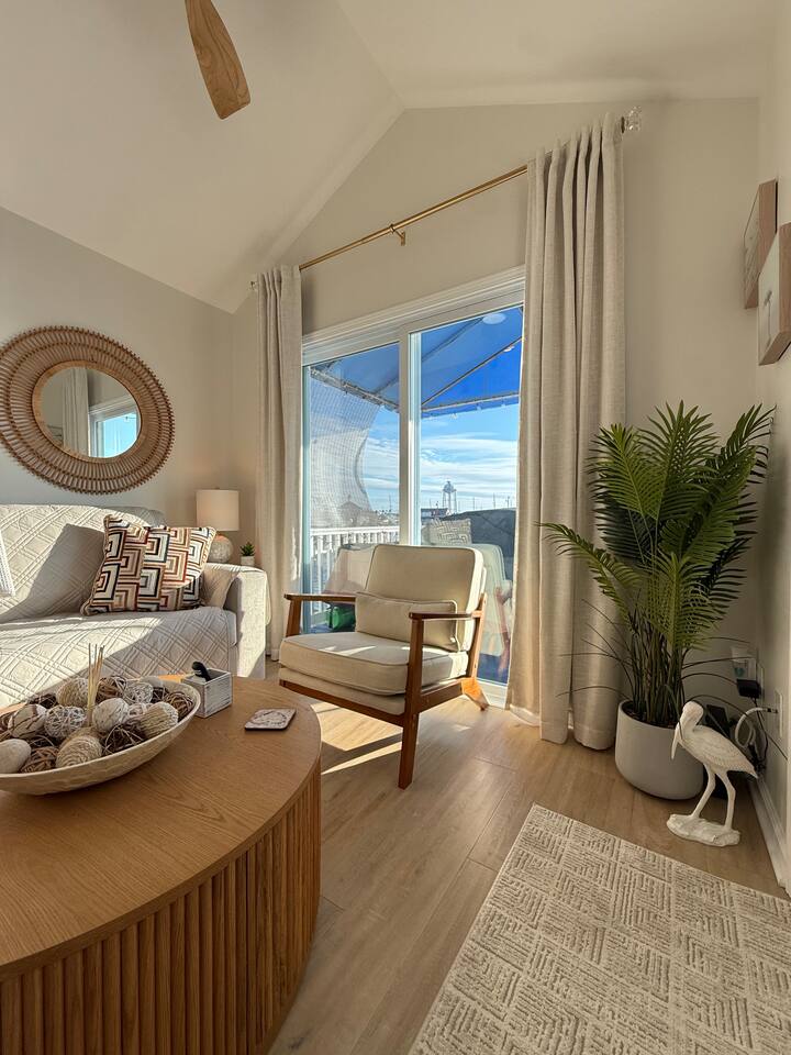 Step into a bright and airy open-concept waterfront retreat, thoughtfully styled with coastal décor and filled with natural light reflecting off the Barnegat Bay. The fully equipped kitchen makes mealtime effortless, and the coffee bar—complete with complimentary K-Cups, tea, sugar, and creamers—sets the perfect tone for calm, easy mornings by the water. With luxury linens, towels, beach towels, high-speed Wi-Fi, Roku Smart TVs, and classic board games, this home provides seamless relaxation for up to 6 guests. The standout feature of this home is the private deck overlooking the Barnegat Bay, offering breathtaking sunrise views and unforgettable sunsets. Here you can enjoy outdoor dining, fire up the BBQ for waterfront meals, or simply unwind above the water with the bay breeze and panoramic views. Beneath the house, a second outdoor retreat awaits—a shaded, sand-level hangout area complete with an outdoor sofa, cozy seating, a mounted outdoor TV, and warm string lighting. This unique space is perfect for relaxing out of the sun, enjoying a movie night outdoors, or gathering with friends and family after a long day at the beach. Your outdoor oasis continues with Tommy Bahama beach chairs, umbrella, sand toys, and games, making both bayfront and oceanfront days effortless. Off-street parking for two vehicles and all essential supplies—paper goods, soaps, shampoo, conditioner, hair dryer, iron, and more—ensure a smooth and stress-free stay. Located directly on the Barnegat Bay and just a short walk or bike ride to the beach and boardwalk, this home offers the ideal mix of peaceful waterfront living and classic Seaside Heights excitement. Spend your days watching the boats drift by, strolling the boardwalk, or simply relaxing on your private deck with an unbeatable view. At your waterfront escape, comfort, convenience, and unmatched bayfront charm come together to create the perfect Jersey Shore getaway. Arrive, unpack, and unwind—your bayside vacation begins the moment you walk in.