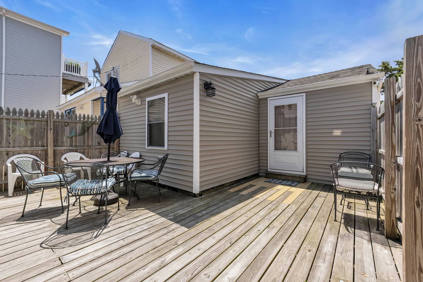 This unique property features two beach cottages for the price of one! The cottages are positioned one in front of the other, sharing a spacious deck and a driveway with parking for 2 cars. Each cottage has its own private entrance, fully equipped kitchen, living room, 2 bedrooms, and 1 bathroom. This property offers a bright and stylish 4-bedroom, 2-bathroom retreat just steps from the shore. Blending modern amenities with coastal charm, it offers a welcoming space for up to 10 guests. The cottages include 2 queen beds, a full-over-full bunk bed, a twin-over-full bunk bed, and a twin-size fold-up bed. Freshly laundered pillows, blankets, sheets, and bath towels are provided for every guest. Enjoy complimentary amenities such as 8 seasonal beach badges ($440 value), Tommy Bahama beach chairs and an umbrella, as well as 2 fully stocked kitchens with K-cups, tea, sugar, creamer, and essential toiletries like toilet paper, paper towels, hand soap, dish soap, body wash, shampoo, conditioner, a hairdryer, and an iron/ironing board. Wi-Fi is also available, making it ideal for remote work. Simply unpack and relax in this well-appointed cottage that offers all the comforts of home to ensure a stress-free and enjoyable stay!